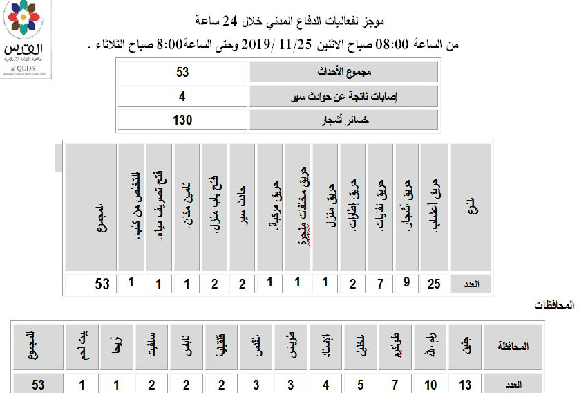 - السيطرة على حريق أشجار في بلدة سردا بمحافظة رام الله عملت طواقم الإطفاء في مركز بير زيت على إخماد النيران ومنع امتدادها لمساحات أكبر.
