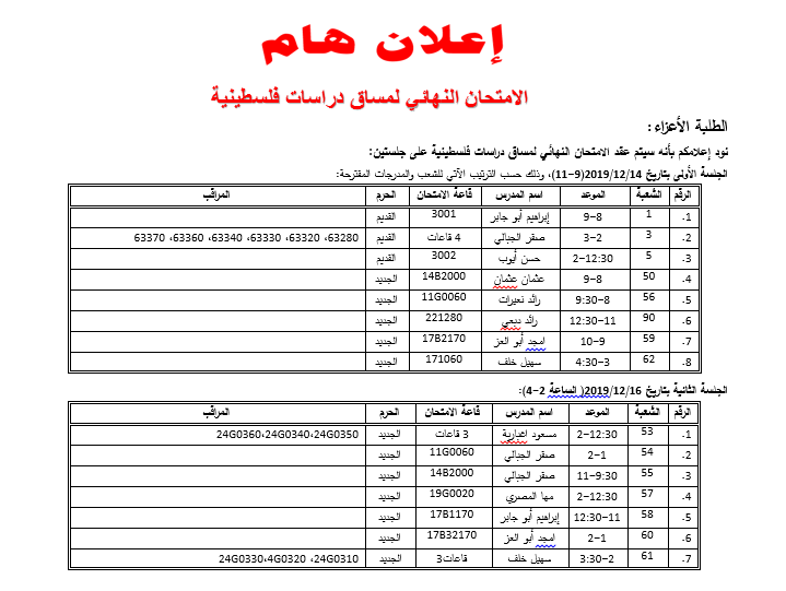 جامعة النجاح تنشر مواعيد امتحانات مساق الدراسات الفلسطينية.
