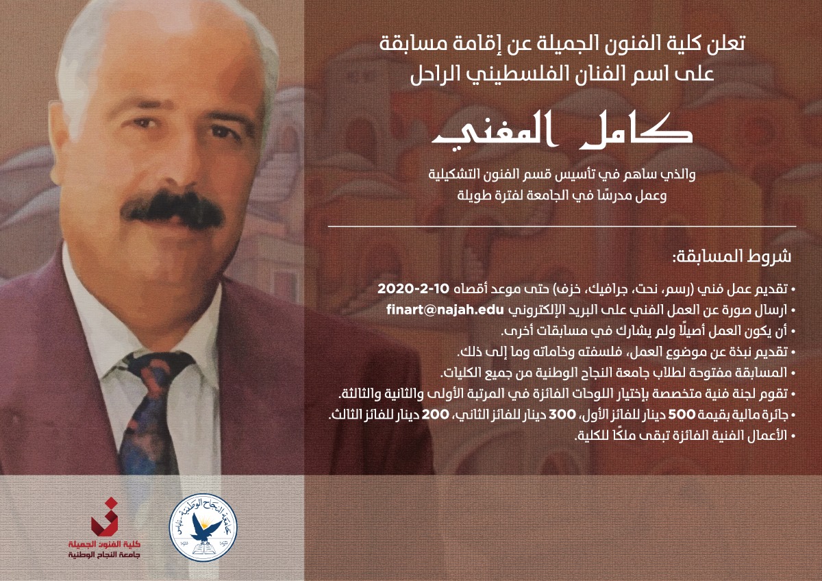 كلية الفنون في جامعة النجاح تعلن عن مسابقة باسم الفنان التشكيلي كامل المغني، الذي كان أحد أساتذتها المؤسسين.