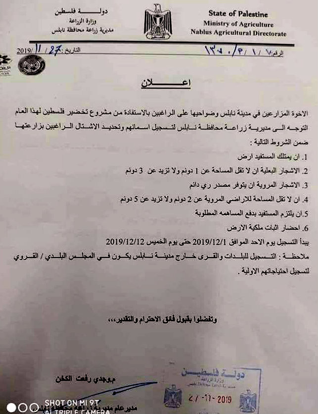مديرية زراعة نابلس تعلن عن فتح باب التقديم لمشروع تخضير فلسطين وتسجيل الأشتال المراد زراعتها ضمن شروط محددة.