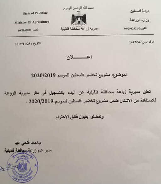 مديرية زراعة قلقيلية تعلن عن فتح باب التسجيل لمشروع تخضير فلسطين للموسم 2019/2020.