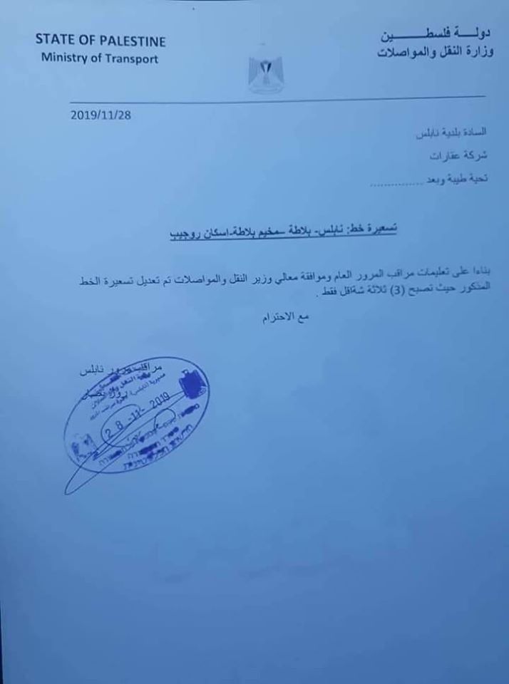 وزارة النقل والمواصلات تقرر رفع تسعيرة خط نابلس - بلاطة روجيب، لتصبح ثلاثة شواكل.