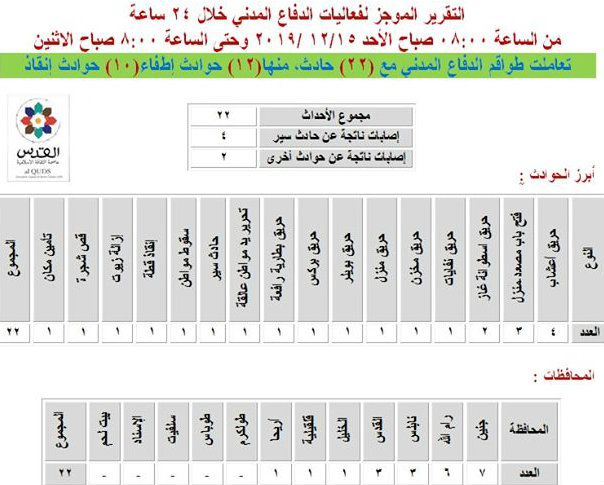 تعاملت طواقم الدفاع المدني مع 22 حادثاً ضمت 12 حالة حرائق و10 حالات تقديم مساعدة خلال يوم الأحد 15.12.2019.
