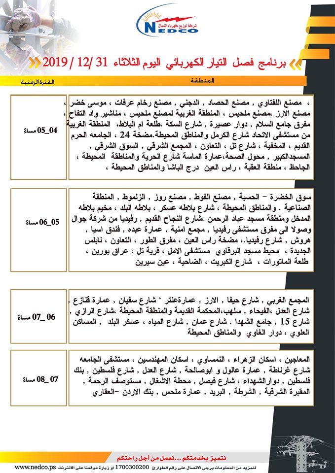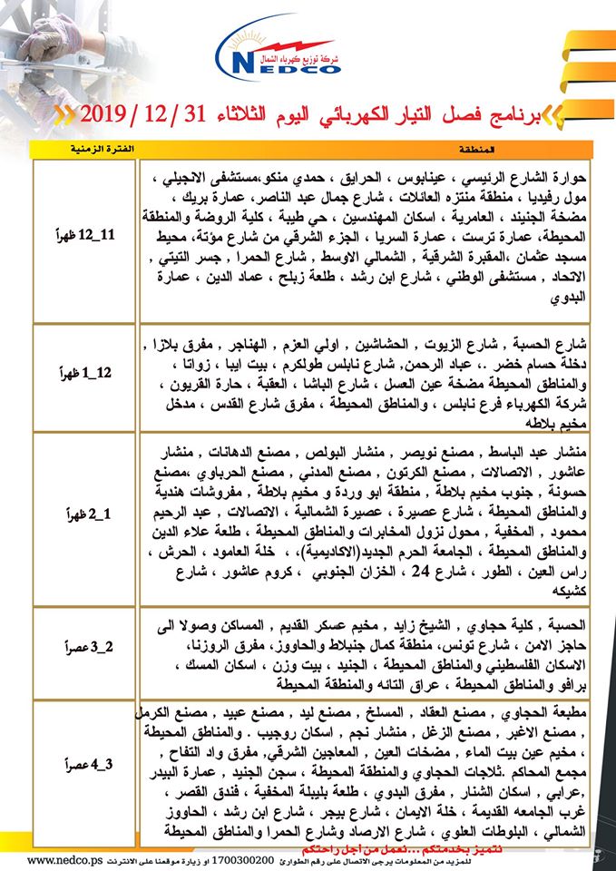 شركة توزيع كهرباء الشمال تنشر مواعيد ومناطق فصل الكهرباء في مدينة نابلس وضواحيها ليوم الثلاثاء 31.12.2019، من الساعة 11:00 صباحا حتى الساعة 8:00 مساء.