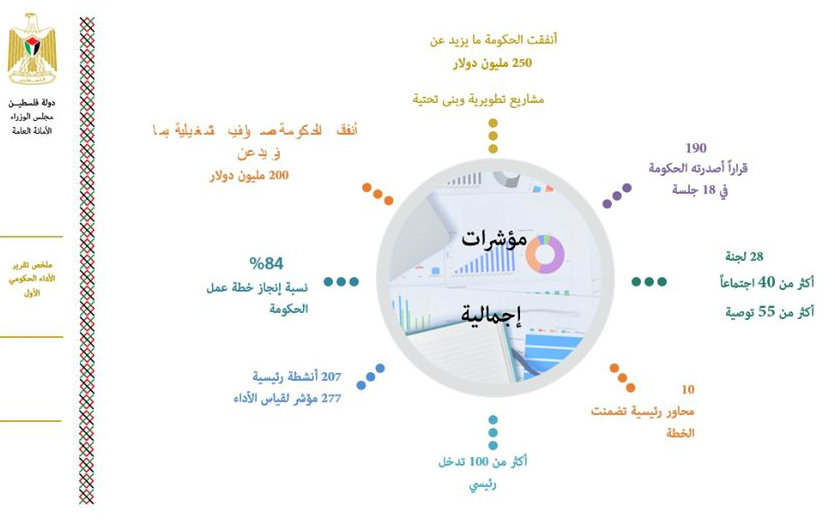نشر موقع مجلس الوزراء الفلسطيني على الفيسبوك، الأربعاء 01.01.2020، ملخص تقرير الأداء الحكومي الأول للحكومة 18، وفق ما يلي: