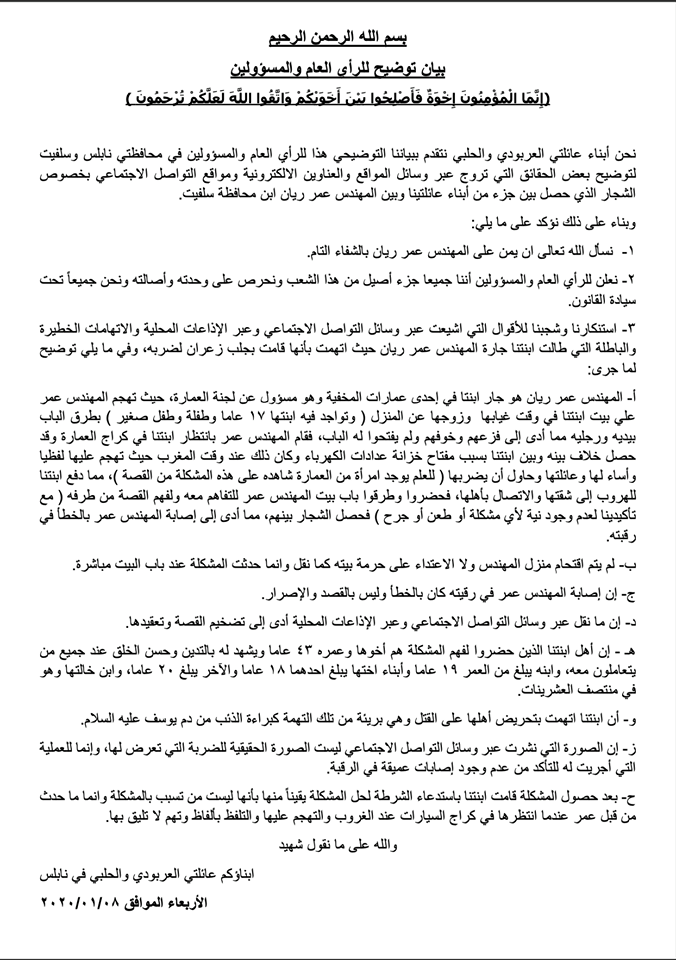عائلتا العربودي والحلبي يصدران بيانا يظهر رواية عائلة جارة الشاب عمر ريان الذي تعرض للاعتداء في نابلس.