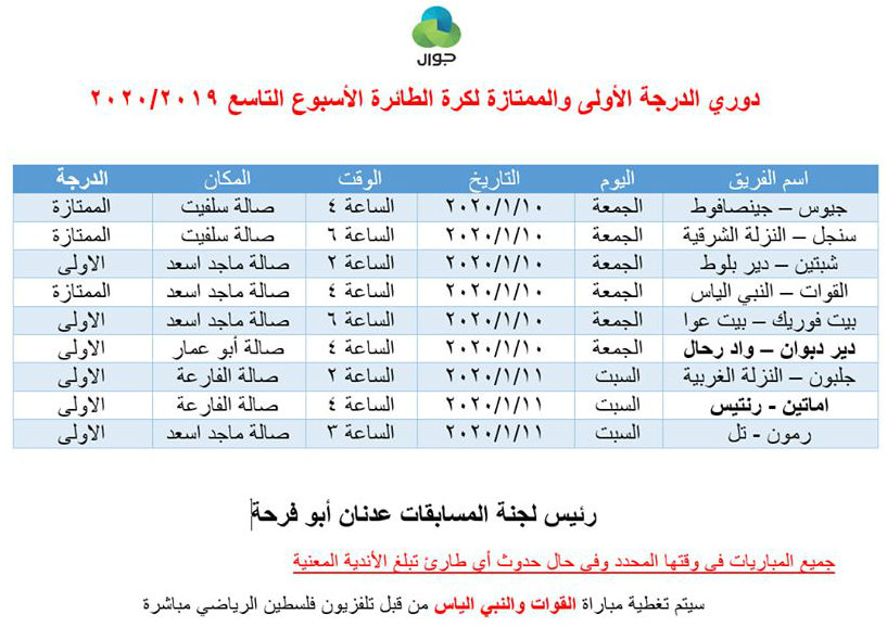 الاتحاد الفلسطيني لكرة الطائرة ينشر مواعيد مباريات دوري الدرجة الأولى للأسبوع التاسع 2019/2020.