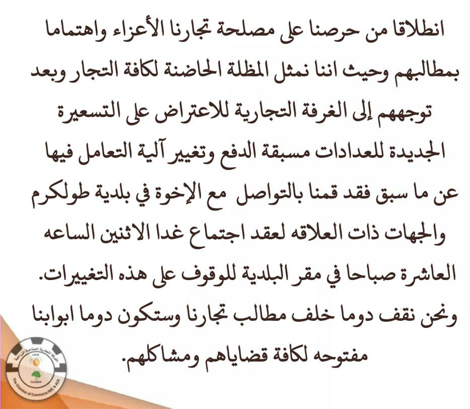 غرفة تجارة طولكرم تعلن عن عقد لقاء مع بلدية طولكرم اعتراضا على التسعيرة الجديدة لعدادات مواقف المركبات.