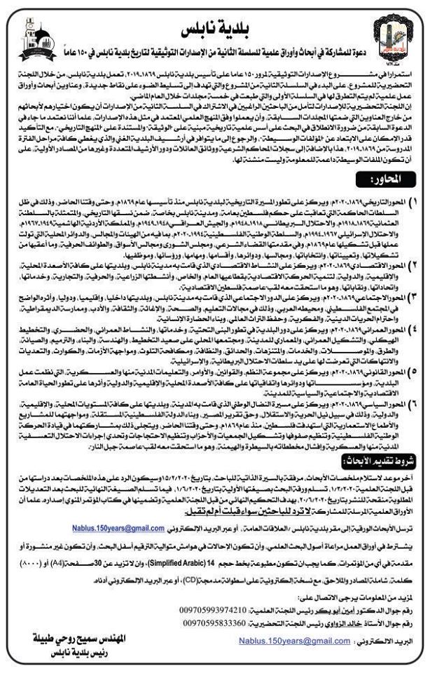بلدية نابلس تدعو الباحثين المهتمين للمشاركة بأبحاث حول تاريخ نشأتها، ضمن المرحلة الثانية من مشروع توثيق تاريخ بلدية نابلس في 150 عاما.