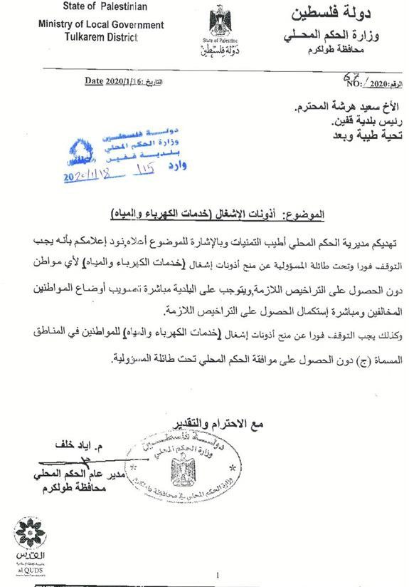 مديرية الحكم المحلي في طولكرم تدعو بلدية قفين إلى وقف منح أذونات الإشغال (خدمات الكهرباء والمياه) قبل الحصول على التراخيص اللازمة من المواطن.