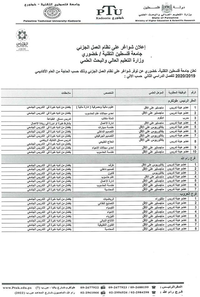 تعلن جامعة فلسطين التقنية- خضوري عن توفر شواغر على نظام العمل الجزئي من العام الأكاديمي 2019/2020 للفصل الدراسي الثاني، وآخر موعد للتقديم هو 23.01.2020.