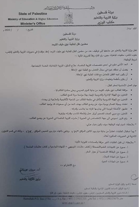 مطلوب معلمي ظل للطلبة ذوي طيف التوحد