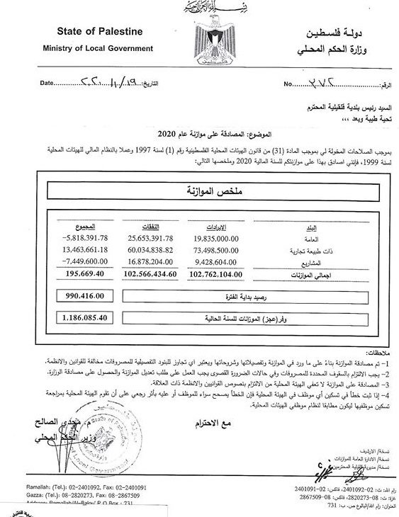 وزارة الحكم المحلي تصادق على موازنة قلقيلية لعام 2020.