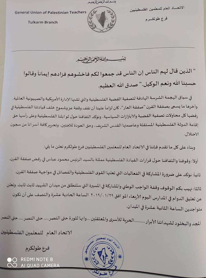 الاتحاد العام للمعلمين الفلسطينيين فرع طولكرم يعلن عن تعليق دوام المدارس للمشاركة في احتجاجات ضد صفقة القرن.