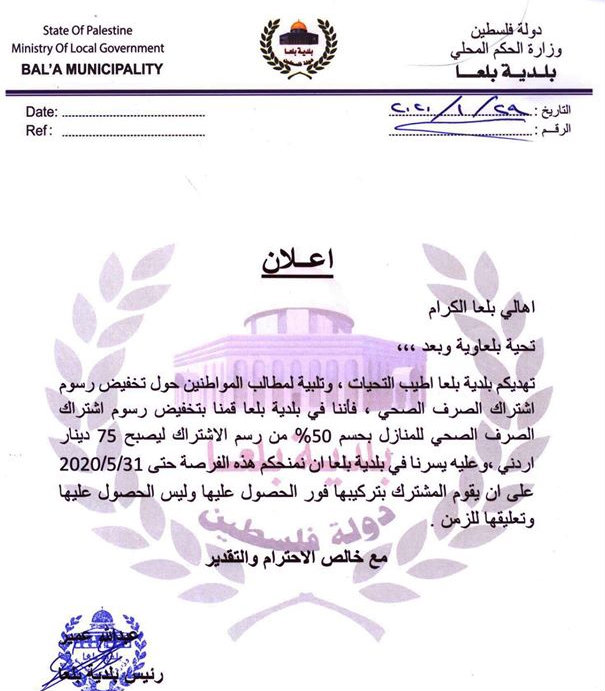 بلدية بلعا تعلن عن خفض رسوم اشتراك الصرف الصحي بقيمة 50%.