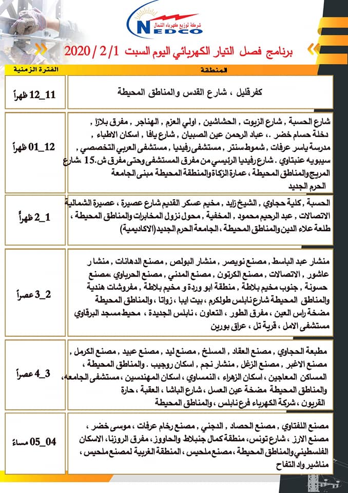 شركة توزيع كهرباء الشمال تنشر مواعيد ومناطق فصل الكهرباء في نابلس، ليوم السبت 01.02.2020، من الساعة 11:00 صباحا حتى الساعة 10:00 مساء.