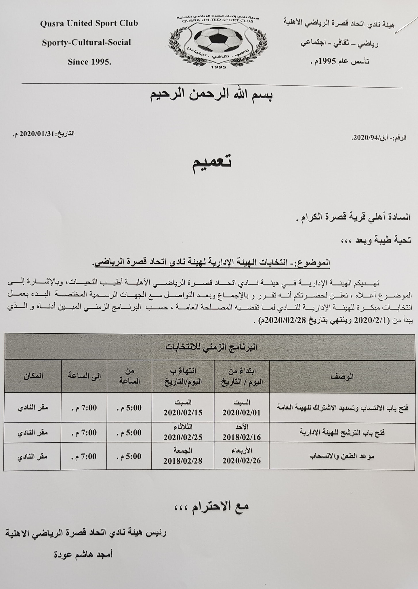 نادي اتحاد قصرة الرياضي يعلن عن فتح باب الانتساب للهيئة العامة وتسديد الاشتراكات.