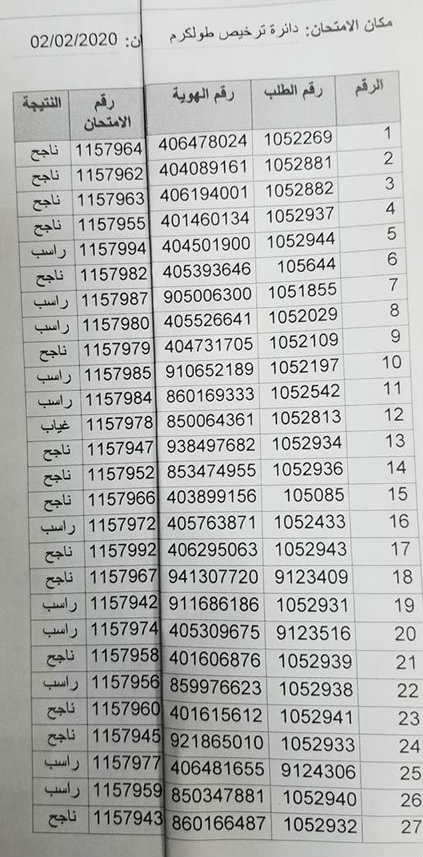 مديرية النقل والمواصلات في طولكرم تنشر نتائج امتحان السياقة العملي.