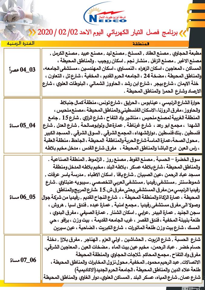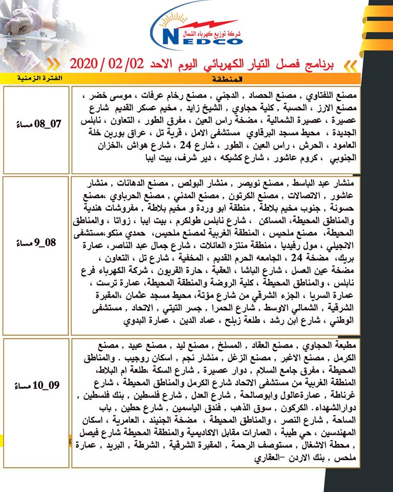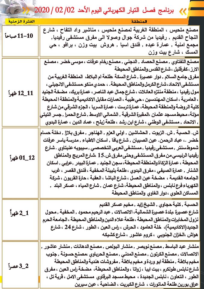 شركة توزيع كهرباء الشمال تنشر مواعيد ومناطق فصل الكهرباء في نابلس ليوم الأحد 02.02.20202، من الساعة 10:00 صباحا حتى الساعة 10:00 مساء.