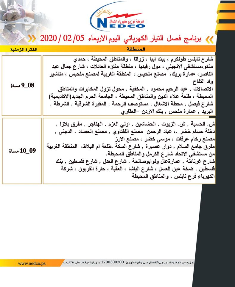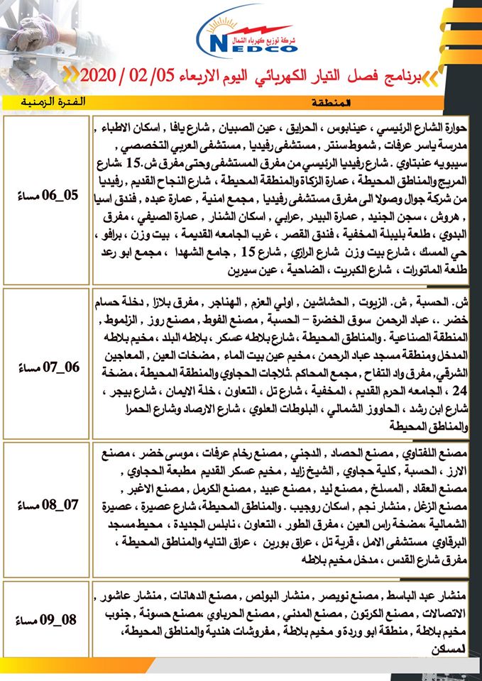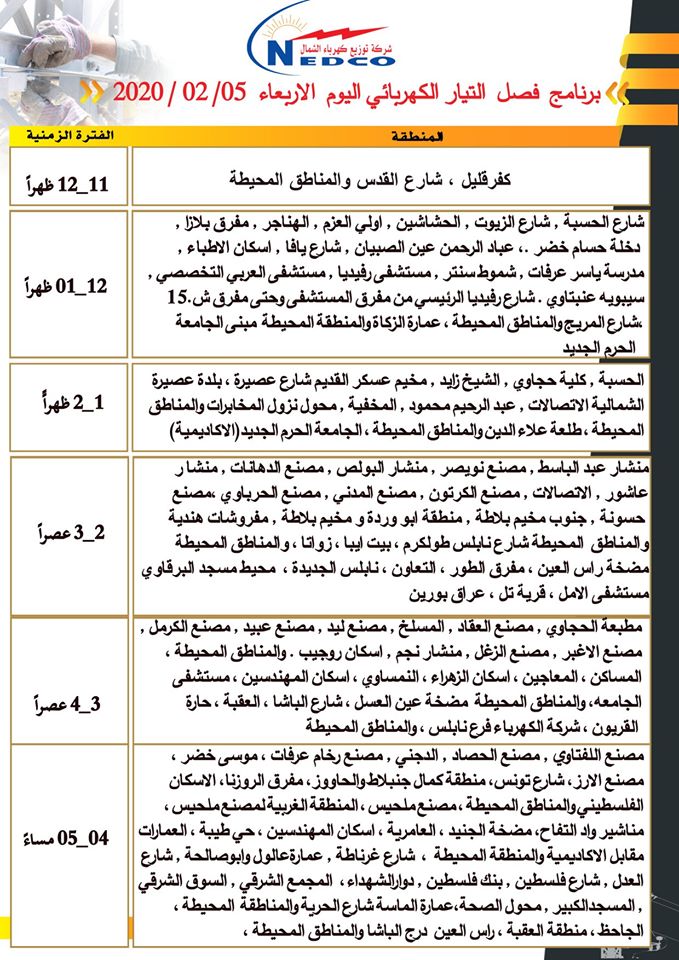 شركة توزيع كهرباء الشمال تنشر مواعيد ومناطق فصل الكهرباء في نابلس، ليوم الأربعاء 05.02.2020، من الساعة 11 صباحا حتى الساعة 10 مساء.