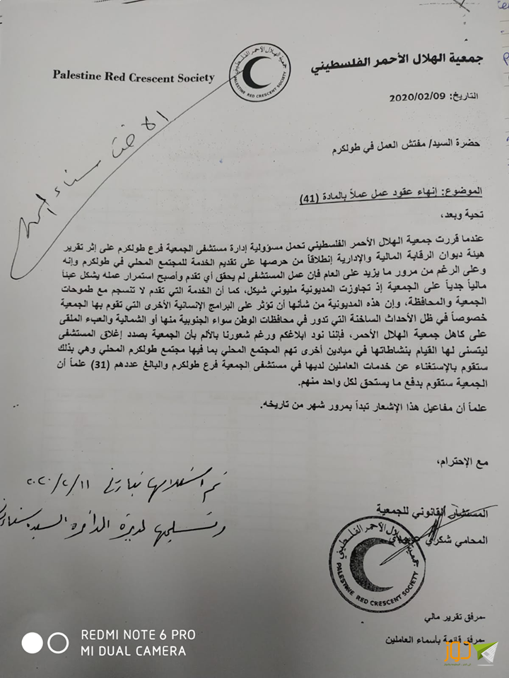 وأكد أبو حرب أن الأمر الذي وصل من جمعية الهلال الأحمر ومقرها الرئيسي في رام الله، يقضي بإنهاء خدمات 31 عاملا في المستشفى التابع للجمعية فرع طولكرم.