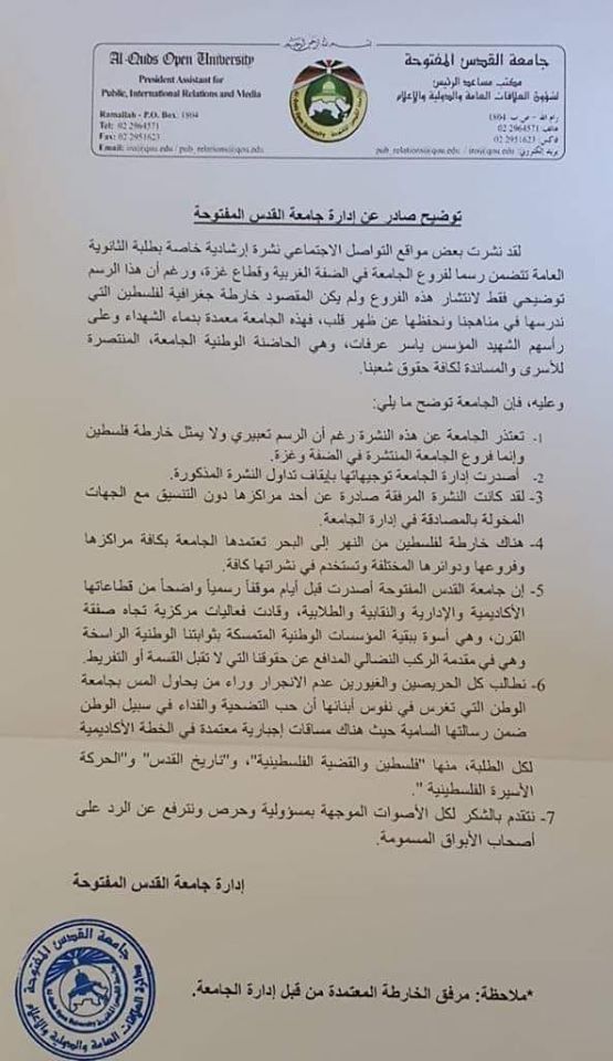 جامعة القدس المفتوحة توقف توزيع نشرة إرشادية لطلبة الثانوية العامة بسبب خريطة أوضحت مواقع فروع الجامعة في الضفة الغربية وقطاع غزة.