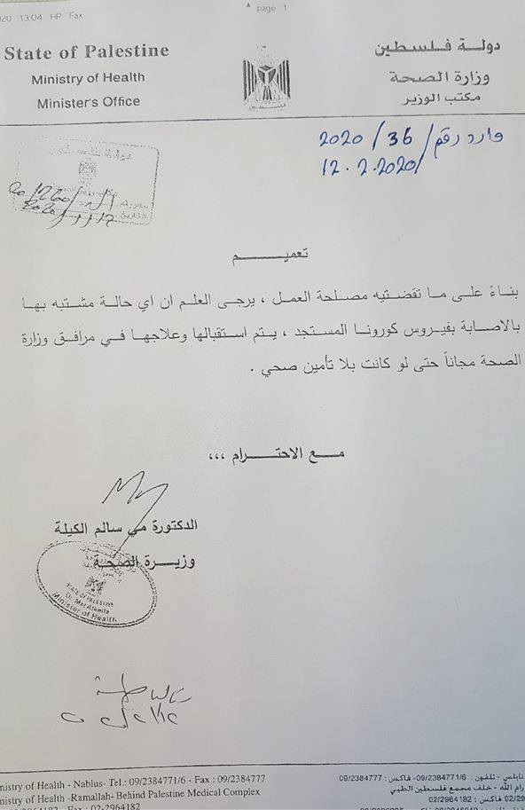 وزارة الصحة تعلن أن فحص وتشخيص وعلاج كورونا الجديد - كوفيد 19، مجاني وبدون تأمين صحي.