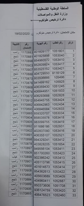 مديرية النقل والمواصلات في طولكرم تنشر نتائج امتحان السياقة العملي.