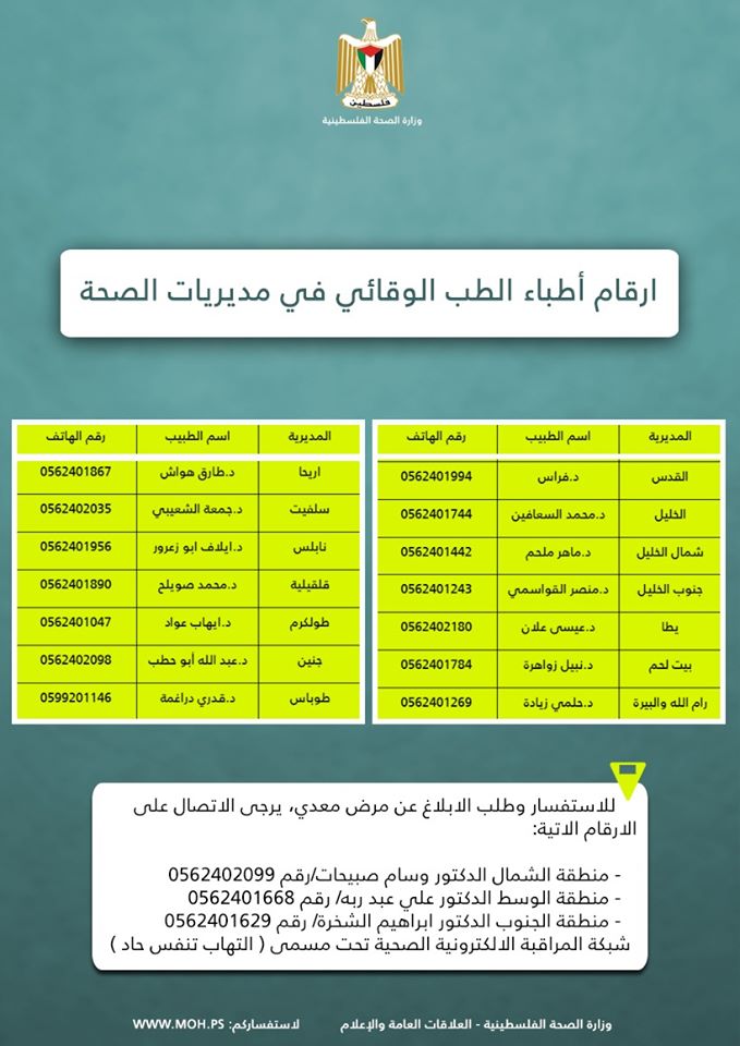وتطلب وزارة الصحة من كل من احتك بهذا الوفد أو تواجد بالقرب منه على مسافة أقل من مترين ولمدة 15 دقيقة على الأقل، أن يقوم بما يلي، حفاظا على ذاته وعائلته ومجتمعه:1- أن يضع نفسه في الحجر المنزلي لمدة 14 يوماً أي لتاريخ 29.02.2020، حيث لا يخالط فيها الآخرين.