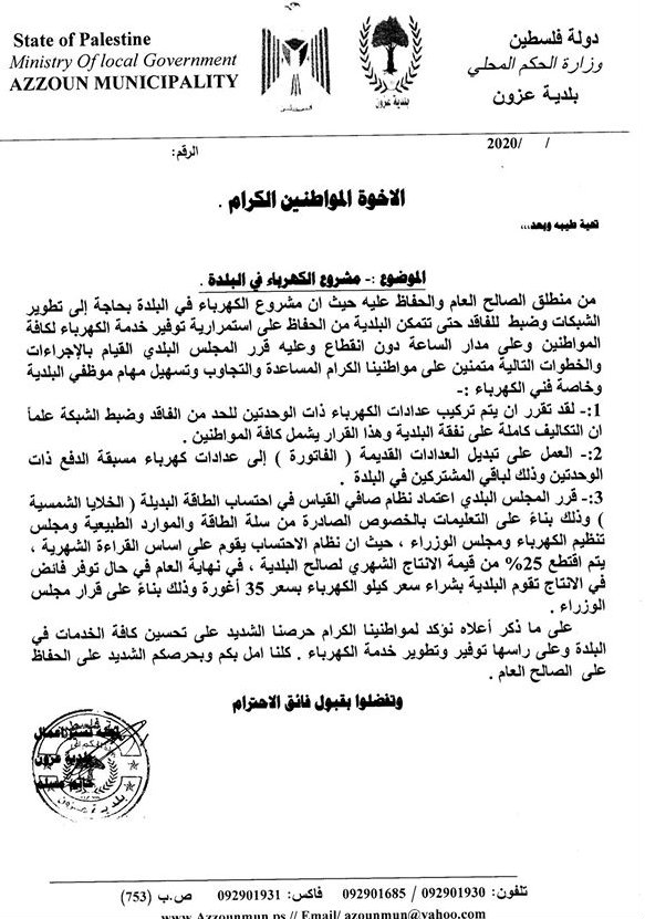 بلدية عزون تصدر عدة قرارات بخصوص مشروع الكهرباء في البلدة لتنظيم الفاقد من الكهرباء.