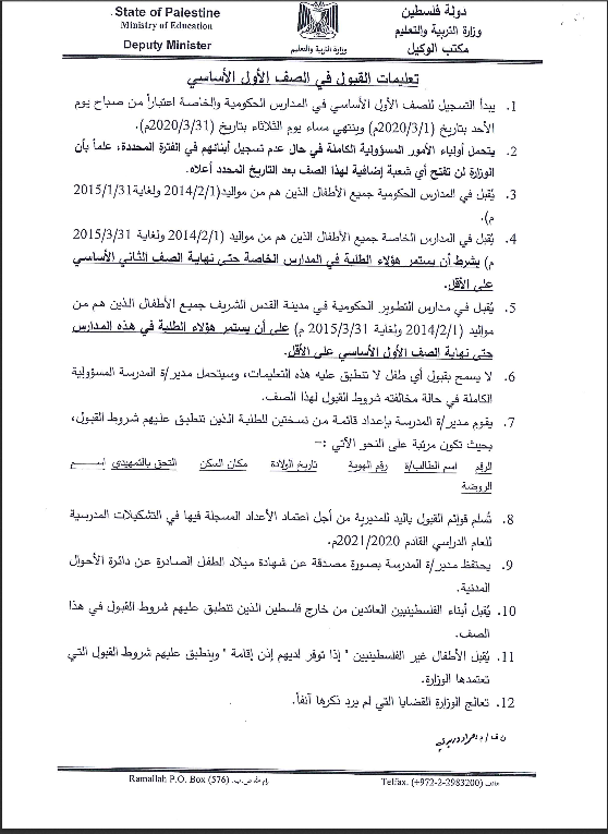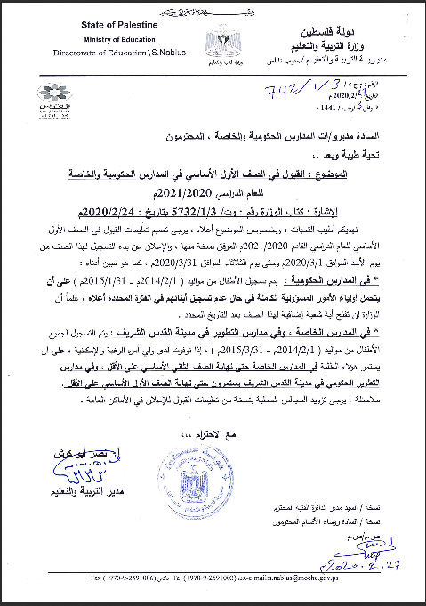 مديرية التربية والتعليم جنوب نابلس تنشر إعلان القبول في الصف الأول الأساسي للمدارس الحكومية والخاصة للعام الدراسي 2020/2021.