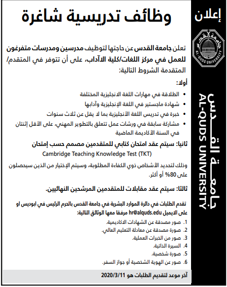 وظائف شاغرة للمعلمين في مركز بطولكرم