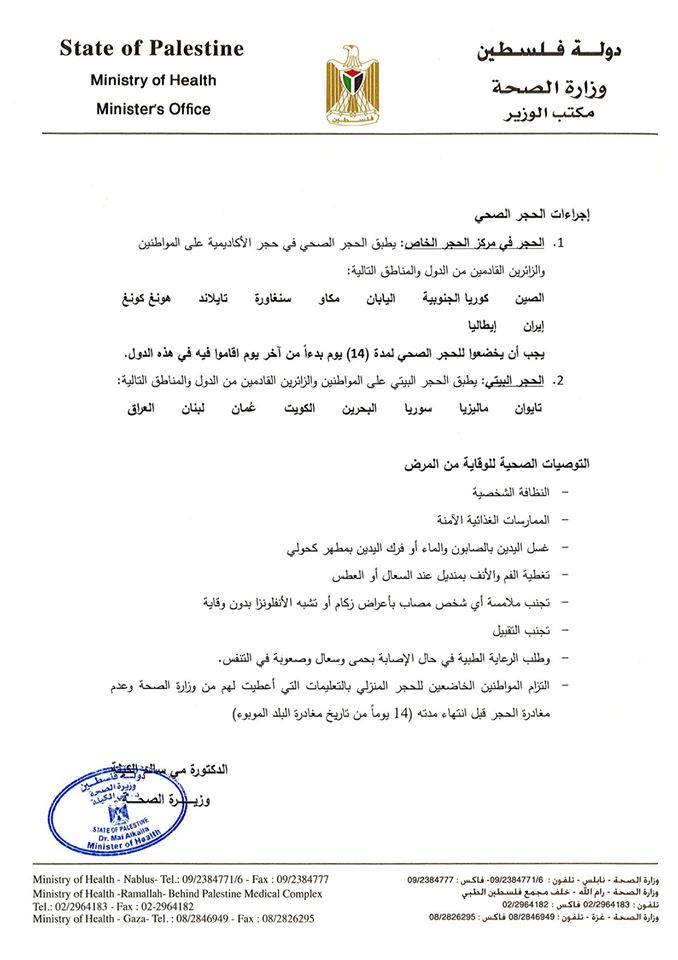 وزارة الصحة تصدر تقريرها اليومي حول الفحوصات المخبرية التي أجرتها على عينات أشخاص مشتبه بإصابتهم بكورونا، مؤكدة خلو فلسطين حتى اللحظة من أي إصابة.