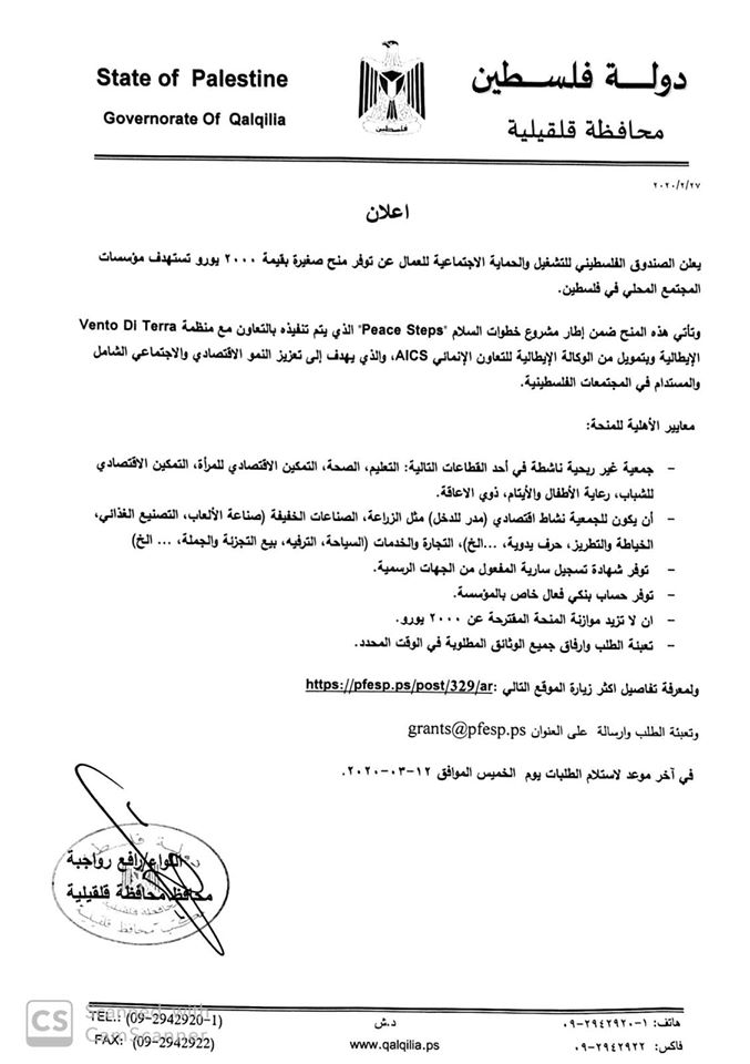 الصندوق الفلسطيني للتشغيل والحماية الاجتماعية للعمال تعلن عن فتح باب التقديم لمنح مالية تستهدف مؤسسات المجتمع المحلي ضمن شروط محددة.