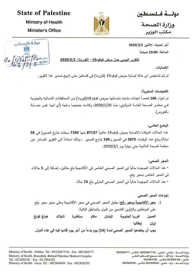 وزارة الصحة تعلن عن آخر المستجدات بخصوص فيروس كورونا، حيث أجرت 166 فحصا لأشخاص مشتبه بإصابتهم بالفيروس والنتيجة خلوها من الفيروس.