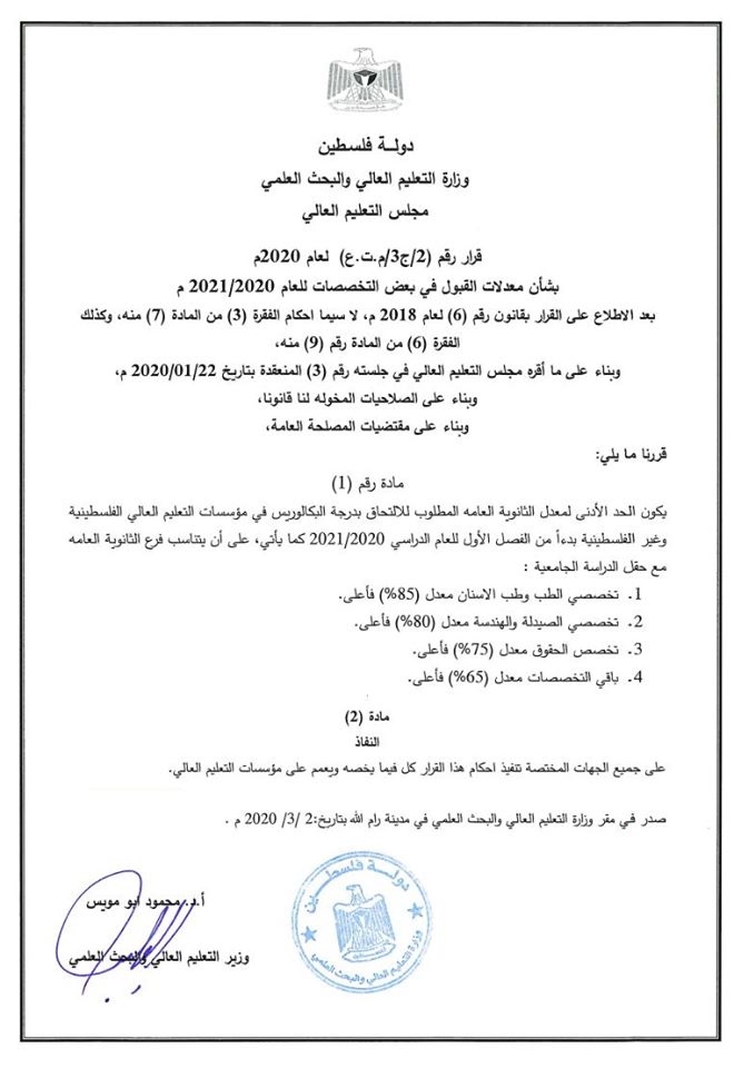 وأشارت الوزارة إلى أن المعدلات الجديدة جاءت بناءً على ما أقره مجلس التعليم العالي في جلسته رقم (3)، التي عقدت بتاريخ 22.01.2020. وعليه طالبت الوزارة من الطلبة الالتزام بقرارات مجلس التعليم العالي بخصوص أسس القبول في الجامعات، مؤكدة أنها لن تعادل أو تصادق أي شهادة تخالف أسس القبول المعلن عنها.