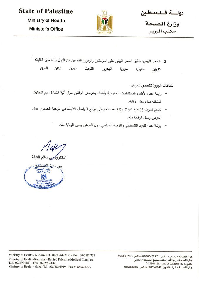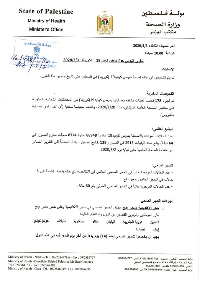 وزارة الصحة تعلن عن آخر المستجدات بخصوص فيروس كورونا، حيث أجرت 178 فحصا لعينات مشتبه بإصابتها بالفيروس من المحافظات الشمالية والجنوبية والنتيجة خلوها من الفيروس.