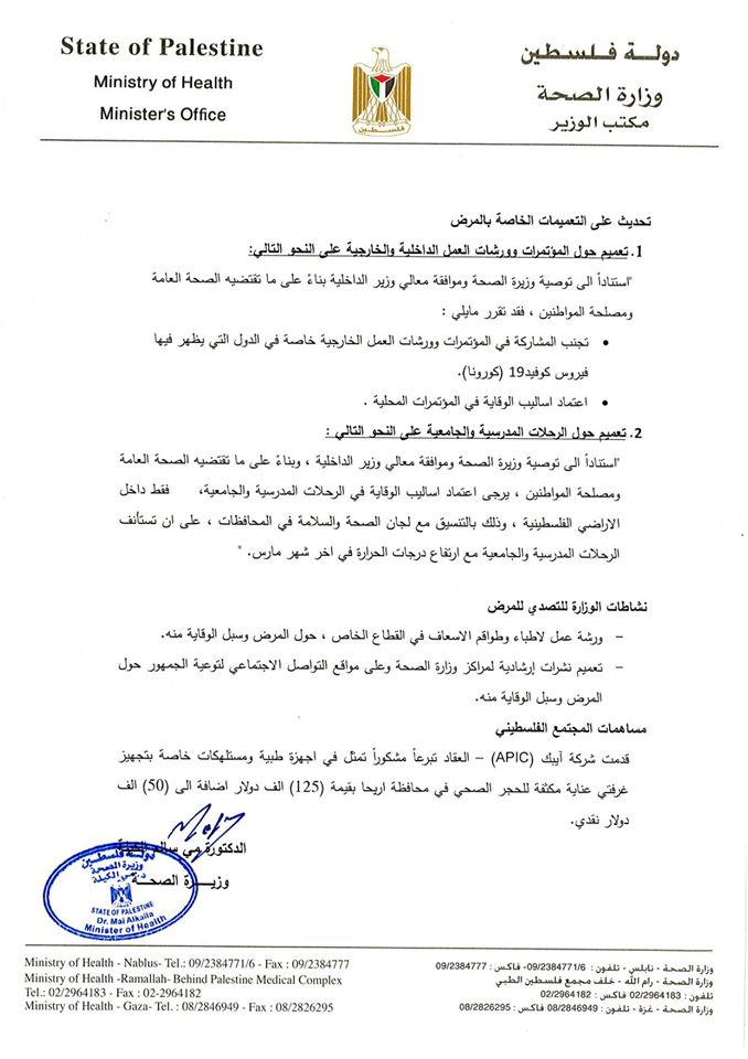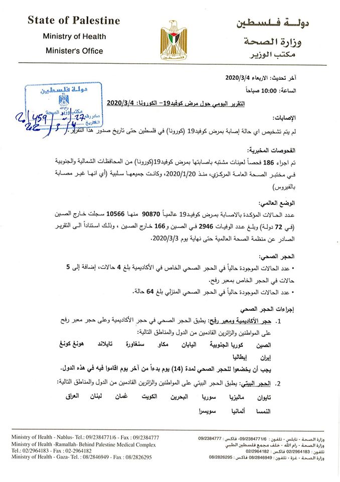 وزارة الصحة تعلن عن آخر المستجدات بشأن فيروس كورونا، حيث أجرت 186 فحصا لعينات مشتبه بإصابتهم بالفيروس والنتيجة خلوهم من المرض.