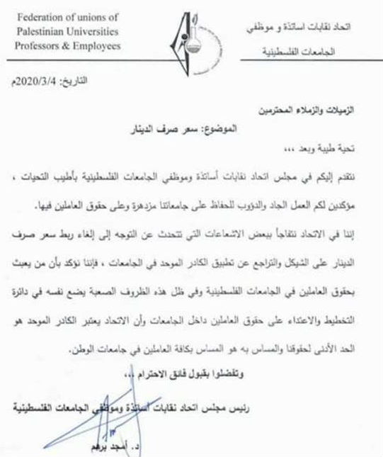 اتحاد العاملين في الجامعات الفلسطينية ينفي إشاعة حول سعر صرف الدينار. ويحذر من المساس بحقوق العاملين في الجامعات الفلسطينية.