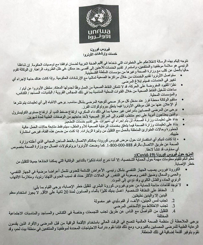 وكالة الغوث الأونروا تعلن عن استمرارها في تقديم الخدمات ضمن خطتها الوقائية من فيروس كورونا.