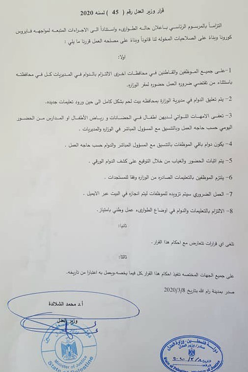 وزارة العدل تصدر بيانا حول إجراءات الدوام بالنسبة للموظفين والأمهات العاملات في المحافظات كافة خلال حالة الطوارئ المفروضة للوقاية من فيروس كورونا.
