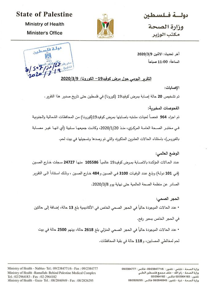 وزارة الصحة تسجل إصابة 20 شخصا بكورونا وتؤكد فرض الحجر الصحي المنزلي على 2618 حالة.