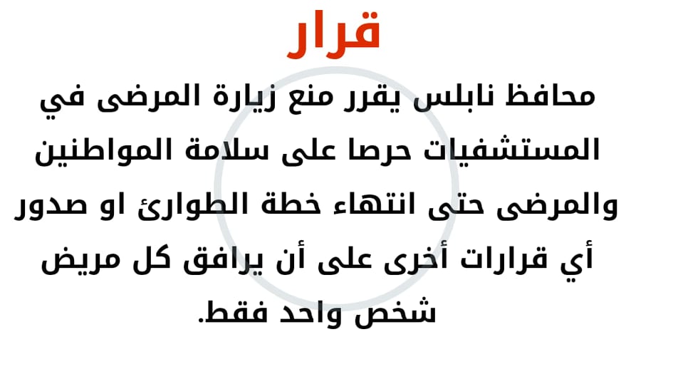 محافظ نابلس يصدر قرارا بمنع زيارة المرضى في المستشفيات حتى انتهاء خطة الطوارئ بسبب فيروس كورونا.
