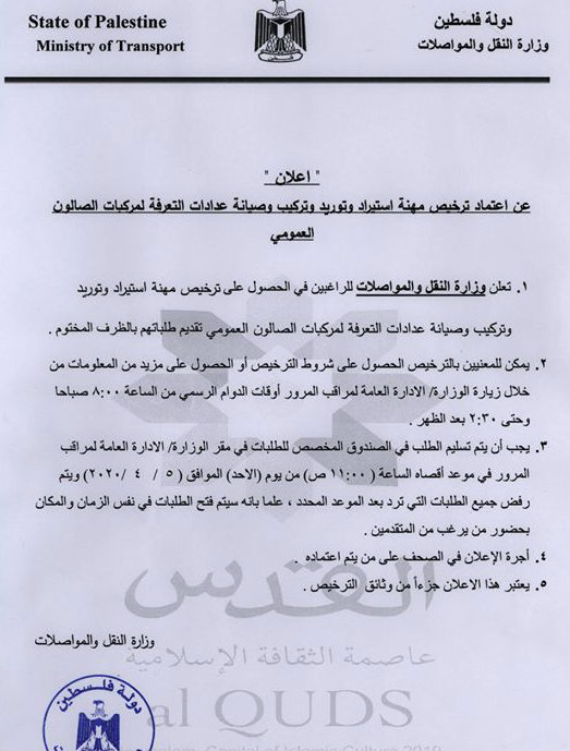 وزارة النقل والمواصلات تنشر تعليماتها بخصوص اعتماد ترخيص مهنة استيراد وتوريد وصيانة عدادادت التعرفة لمركبات الصالون العمومي.