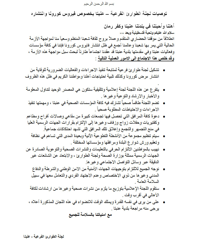توصيات طوارئ عنبتا وكفر رمان بخصوص كورونا