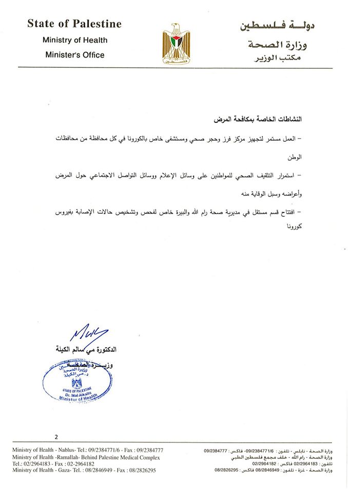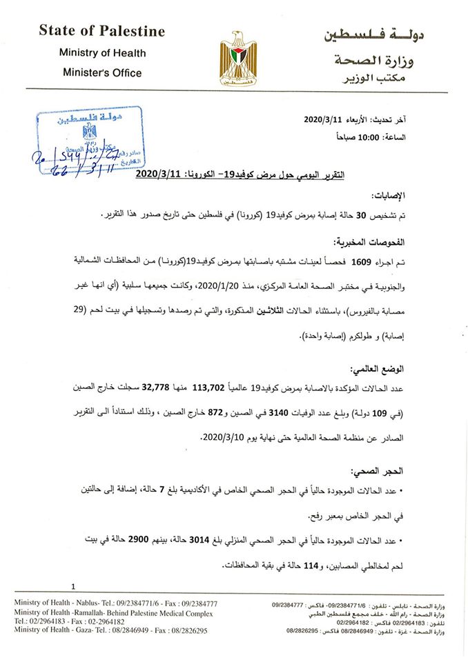 وزارة الصحة تجري 1609 فحوص لعينات يشتبه بإصابتهم بفيروس كورونا والنتيجة خلوهم من المرض، باستثناء الثلاثين حالة المعلن عنها مسبقا في بيت لحم وطولكرم.