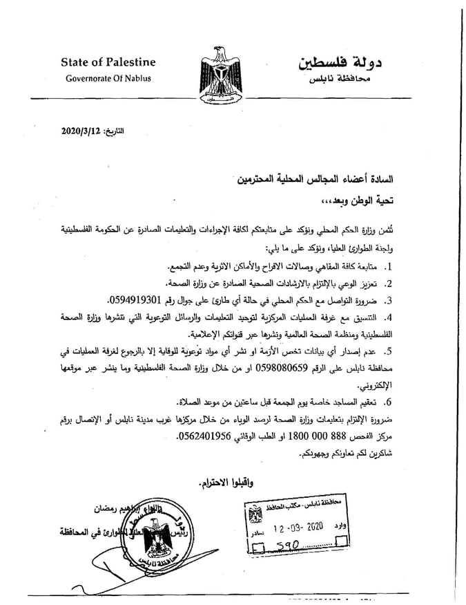 لجنة الطوارئ العليا في محافظة نابلس تنشر إجراءات وقائية من فيروس كورونا وتحث على ضرورة الالتزام بها.