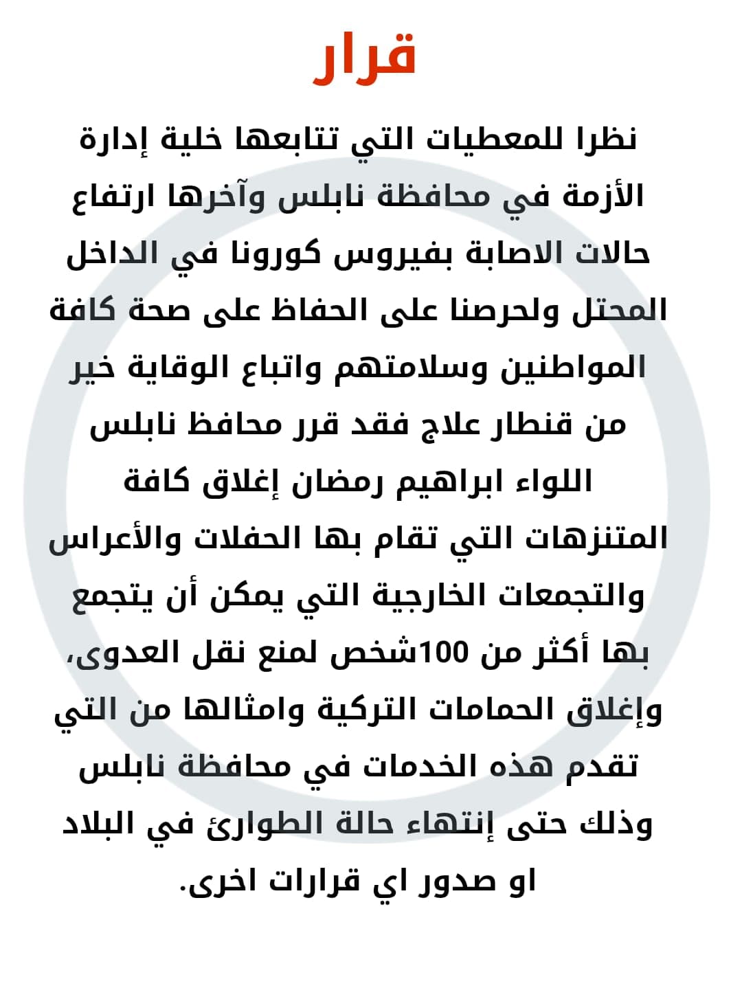 محافظ نابلس إبراهيم رمضان يصدر قرارا بإغلاق المنتزهات التي تقام بها الحفلات والأعراس والتجمعات الخارجية، كإجراء احترازي لمنع نقل فيروس كورونا.