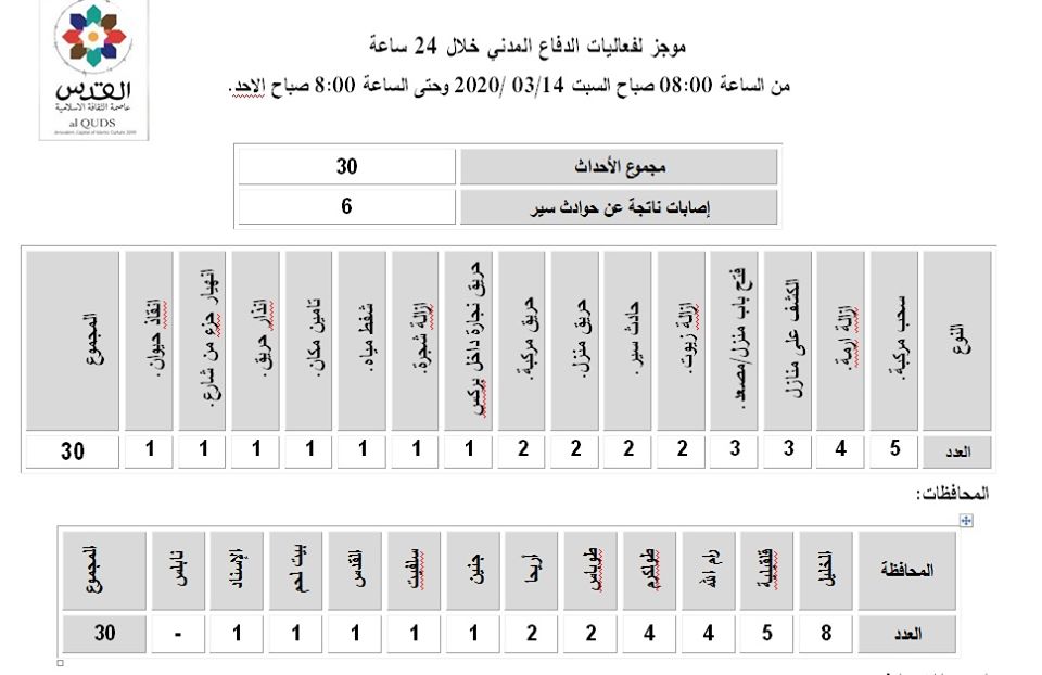 أبرز الحوادث:- إخلاء 6 إصابات وصفت ما بين الطفيفة والمتوسطة إثر حادثين في رام الله وسلفيت.