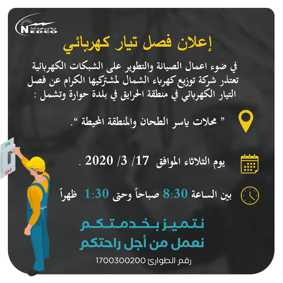 شركة توزيع كهرباء الشمال تعلن عن نيتها فصل الكهرباء في حوارة لـ5 ساعات.
